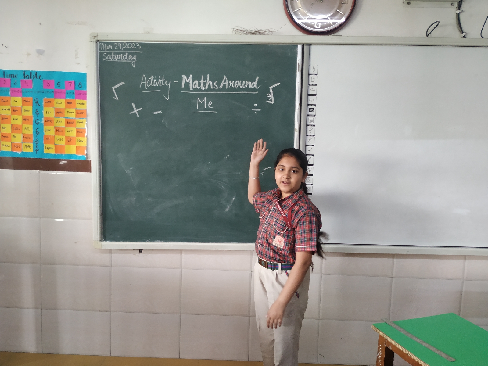 The students presented various real life objects and examples where they see mathematics which includes timetable pasted in the classroom, the tiling of the floor, the lockers and almirah kept there, the doors of the classroom, the room itself, the lift in the school premises, the stairs we use, daily routine purchases (like bread, milk etc.), the distance covered, time taken and speed in reaching school, discount or sale, cooking, recipe, observing different patterns and many more.